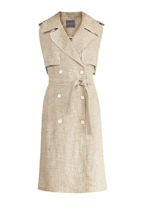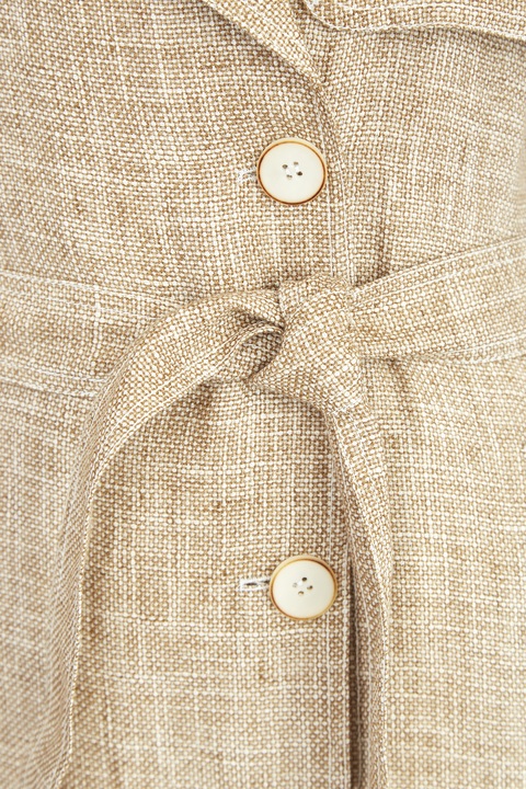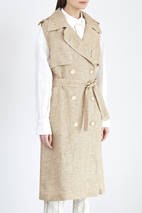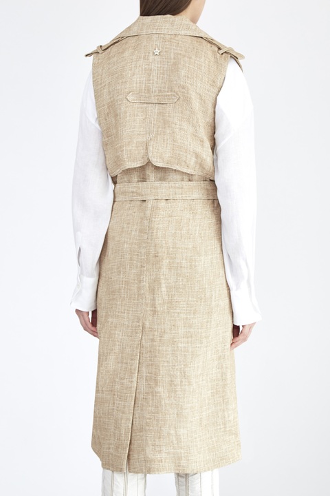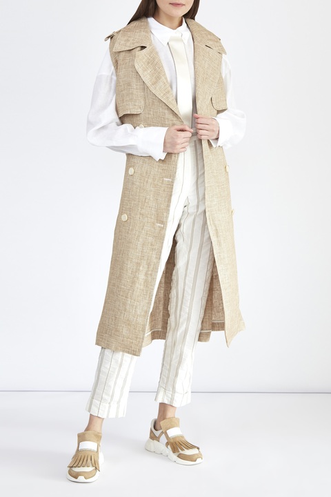 Удлиненный двубортный жилет из фактурного льна с лацканами и поясом