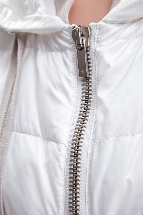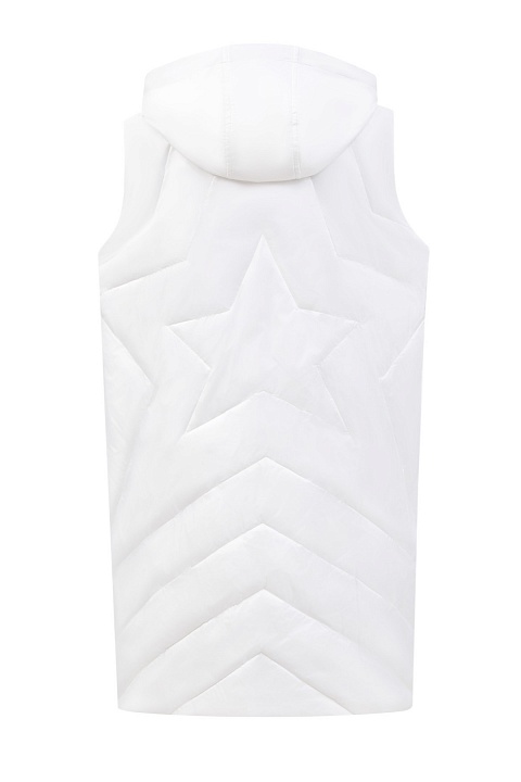 Удлиненный жилет от Lorena Antoniazzi из плотной матовой тафты. Расслабленный стиль всему образу задает фигурная стежка в виде символики бренда и заимствованный у бомбера ворот из трикотажа с люрексом. Капюшон на кулиске дополнительно защищает лицо от ветра. Детали: подкладка из нейлона, два кармана, объемный утепляющий слой.