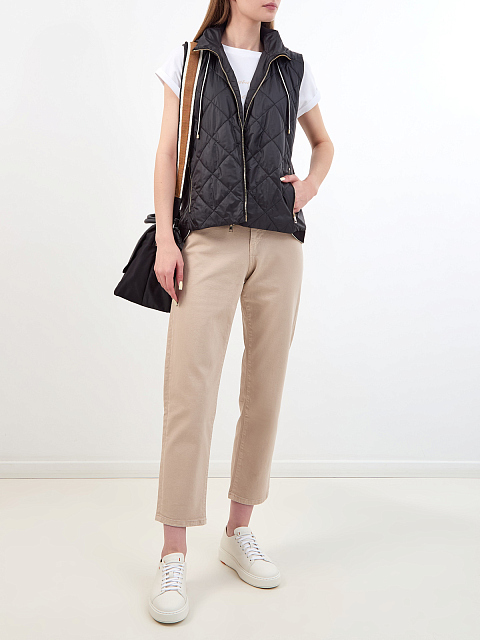 Жилет из ветрозащитного стеганого нейлона от Lorena Antoniazzi. Гладкая фактура материала с атласным блеском дополнена высоким трикотажным воротом и контрастной окантовкой. Капюшон оснащен кулиской для индивидуальной регулировки. Два прорезных кармана на молниях подчеркивают динамичные линии кроя. Детали: застежка на молнию с двойным пуллером, трикотажная отделка нижнего края. Сделано в Италии.