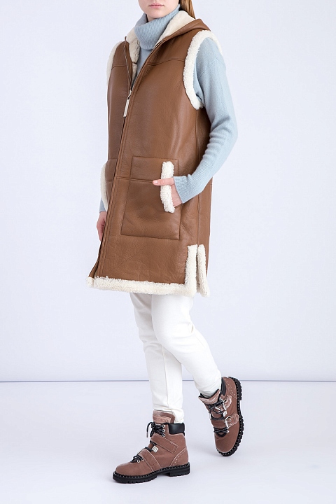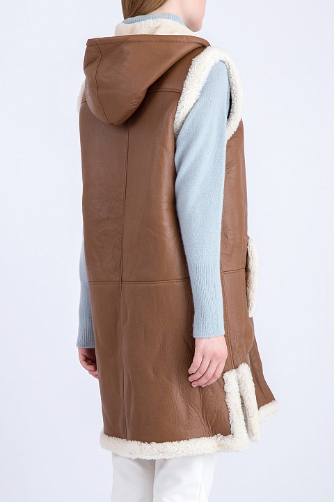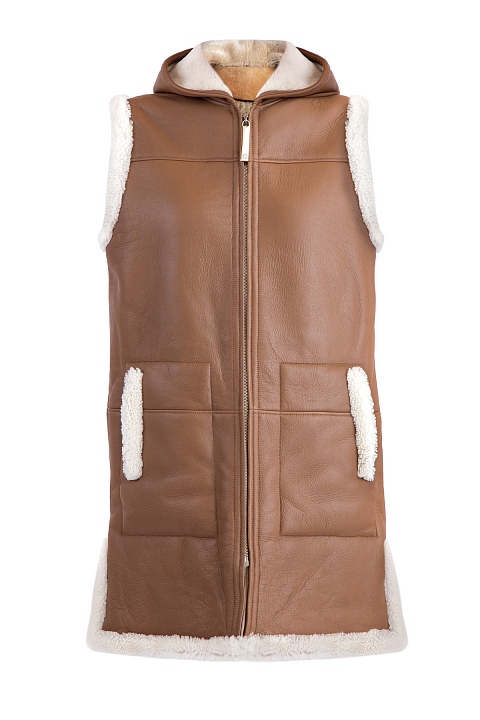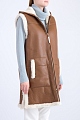 Утепленный двусторонний женский жилет Maison Ullens, созданный из овчины коричневого тона и ворсистой меховой изнаночной стороной. Модель характеризуется капюшоном и карманами по бокам. Застежка осуществляется на замок-молнию в центральной планке. Сделано во Франции.
