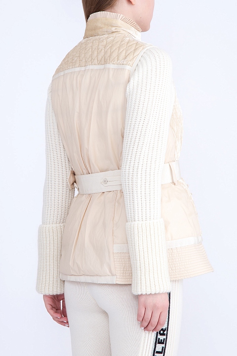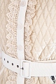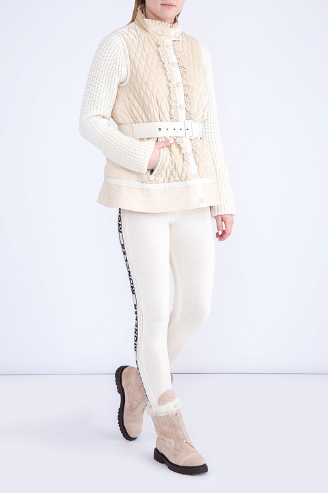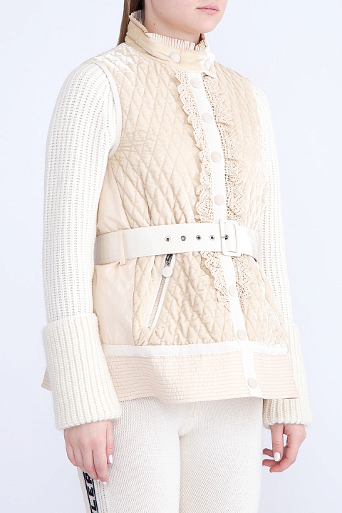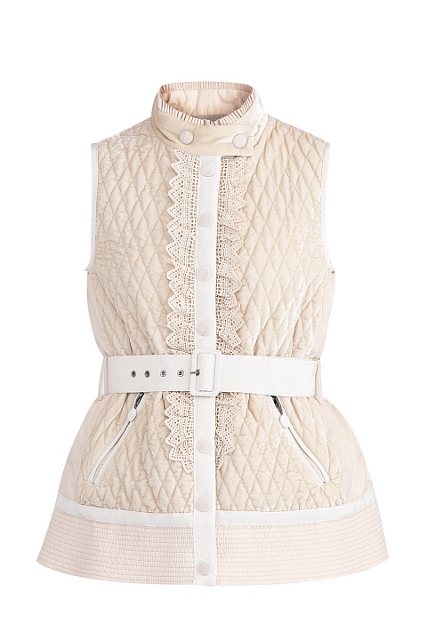 Утепленный жилет «Marianne» бренда Moncler, отличительной особенностью которого стало сочетание контрастных тканей кремового оттенка. Модель приталенного силуэта характеризуется стеганой бархатистой поверхностью с нейлоновыми вставками и изящным хлопковым кружевом на передней планке. Высокий воротник-стойка дополнен оборкой в тон, а широкий текстильный ремень придает образу еще больше элегантности. Модель без подкладки, с прорезными карманами по бокам.