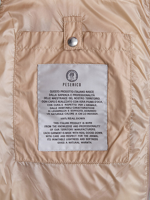 Стеганый жилет в бежевой гамме от Peserico сочетает влагозащитный матовый нейлон и вязаные вставки из мерцающего трикотажа. Утеплитель из невесомого гусиного пуха и пера делает модель идеальной для составления многослойных образов, блестящая цепочка Punto Luce на прорезных карманах завершает дизайн. Детали: регулируемый капюшон, застежка на молнию с двойным пуллером. Сделано в Италии.