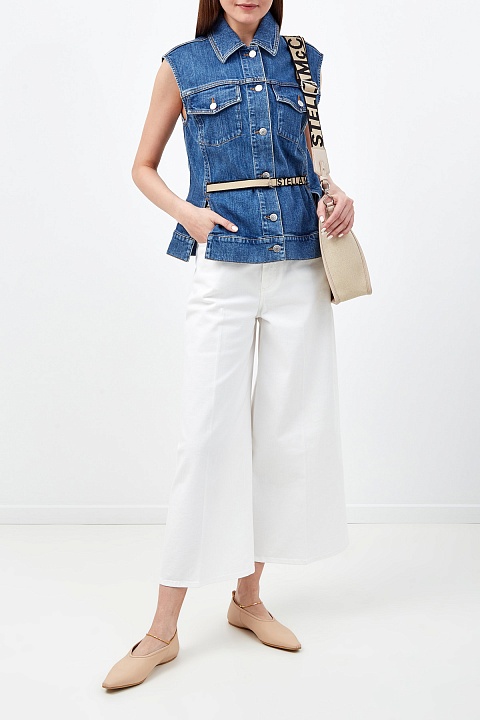 Жилет из плотного денима от Stella McCartney выполнен из органического хлопка без применения токсичных химикатов. Переплетение нитей двух цветов придает ткани легкий винтажный эффект. Сохраняющий форму материал визуально структурирует силуэт. Особенностью модели стали разрезы по бокам и пояс с фирменным принтом. Детали: застежка на пуговицы, два кармана с клапанами.