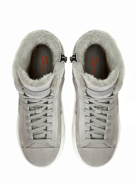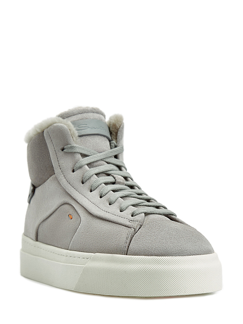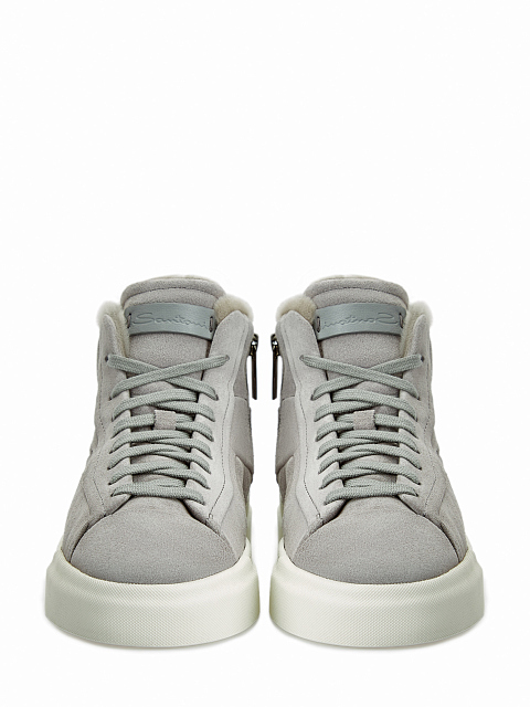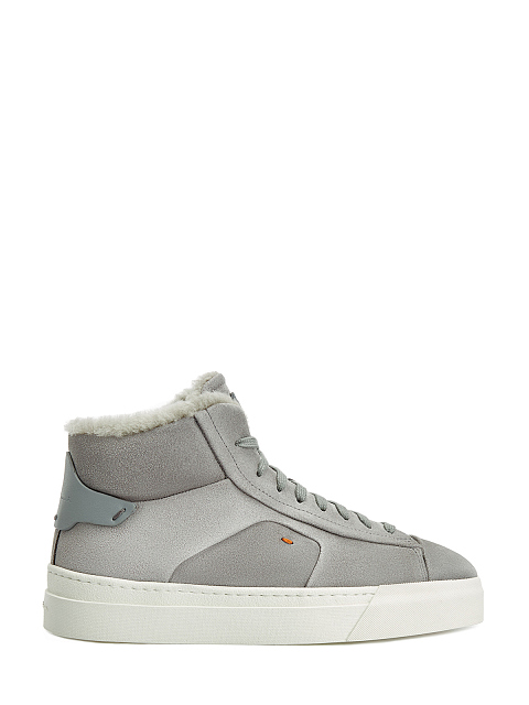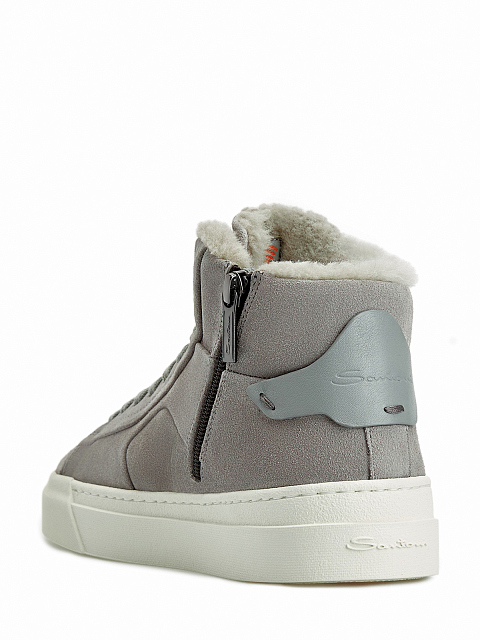 Высокие женские кеды от Santoni созданы вручную из гибкой бархатистой замши в пепельно-сером оттенке. Подкладка из натурального меха кролика обеспечивает максимальный комфорт в холодное время года. Модель оснащена амортизирующей литой подошвой и боковой застежкой на молнию с брендированным пуллером. Фирменный стиль подчеркивают кожаные вставки с тиснением и узнаваемая оранжевая стежка. Сделано в Италии.
