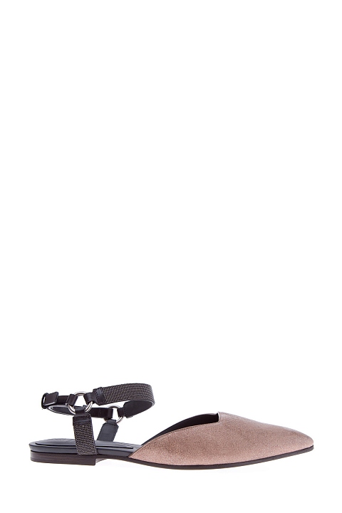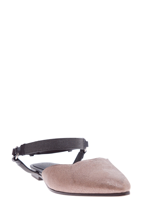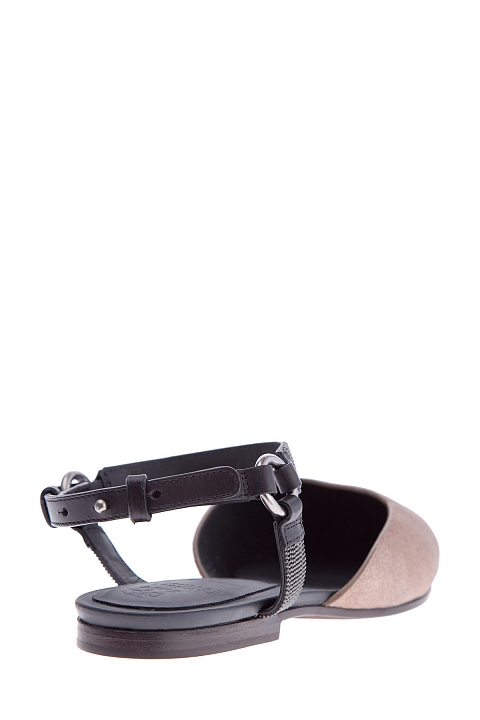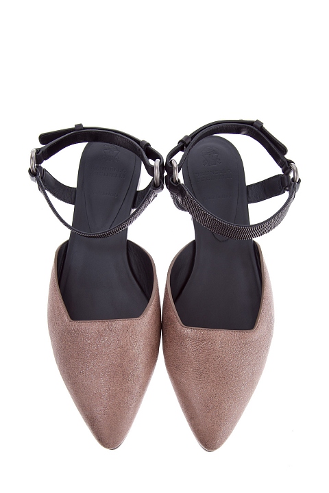 Эффектные балетки Shiny из весенне-летней коллекции Brunello Cucinelli с остроконечным мыском из козьей кожи с сияющим напылением, гармонично сочетающейся с матовой черной кожей теленка на ремешках с бусинами монили, опоясывающими щиколотку. Подошва дополнена небольшим устойчивым каблуком с нескользящими вставками. Сделано в Италии.