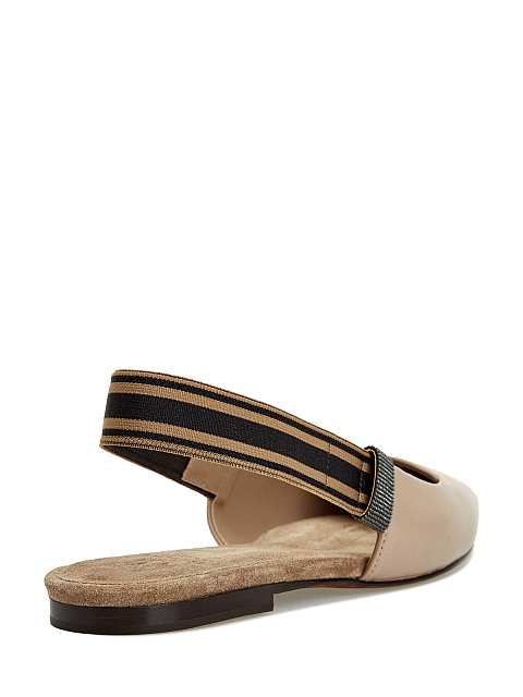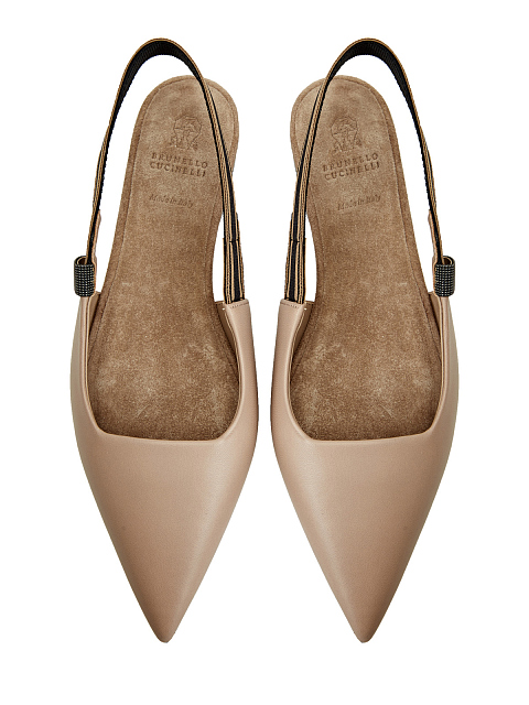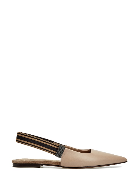 Туфли-балетки на плоской подошве от Brunello Cucinelli сочетают женственную эстетику и неформальные детали. Элегантные линии и мягкая текстура наппы создают изящный контраст со спортивной деталью — эластичной лентой в полоску. Ценная вставка, вышитая тонкими рядами блестящей цепочки Мониль, завершает модель легендарным декором Модного Дома. Сделано в Италии.