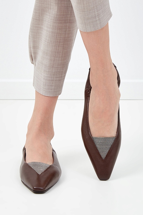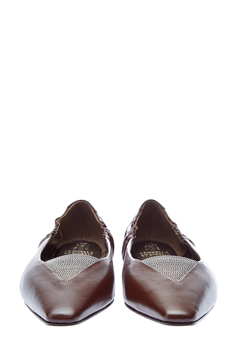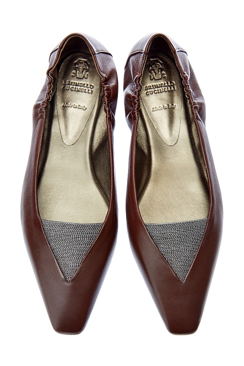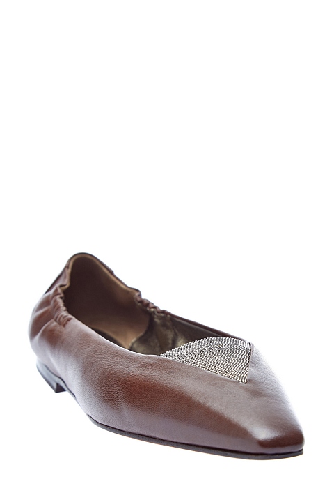 Базовые балетки от Brunello Cucinelli созданы из полированной мелкозернистой кожи в благородном коньячном оттенке. Вышивка цепочками Мониль выполнена мастерами бренда вручную, заостренный квадратный мысок олицетворяет классику и строгость, а мягкая спинка с эластичной вставкой обеспечивает комфорт. Подошва из кожи дополнена противоскользящей вставкой. Сделано в Италии.