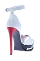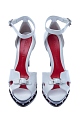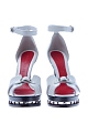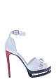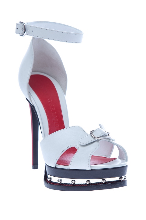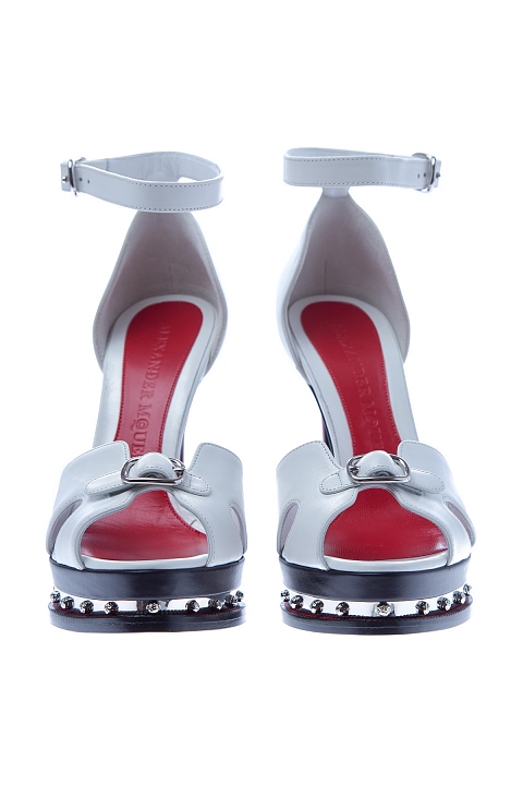 Эффектные босоножки Alexander McQueen, выполненные из телячьей кожи трех цветов: белого, красного и черного. Модель с резным мыском, напоминающим крылья бабочки. Резная платформа украшена металлической пластиной с чеканными заклепками. Застежка осуществляется на ремешок с пряжкой на щиколотке. Высота платформы под мыском 2,5 см, высота каблука 12,5 см. Сделано в Италии.