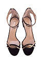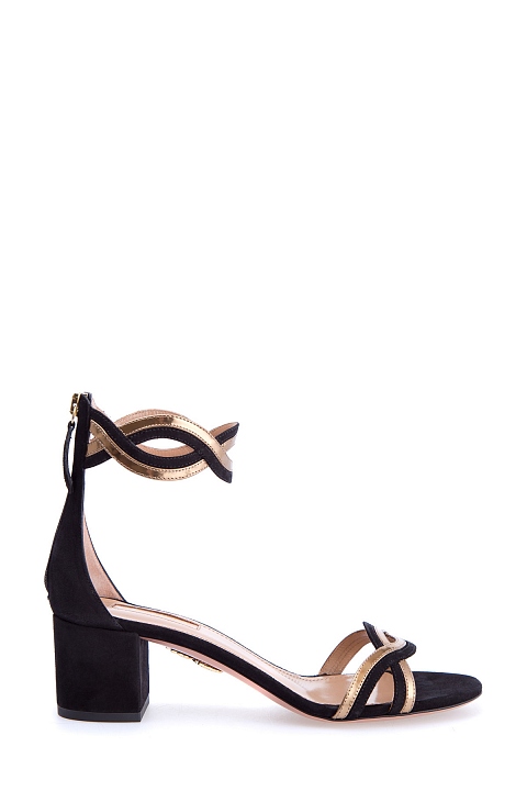 Изящные босоножки Moon Ray Sandal 50 из коллекции Aquazzura из бархатистой гибкой замши черного цвета в сочетании со вставками из ламинированной телячьей кожи с золотым напылением. Кожаная стелька и подошва дополнены символами бренда. Высота каблука 5 см. Сделано в Италии.