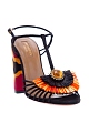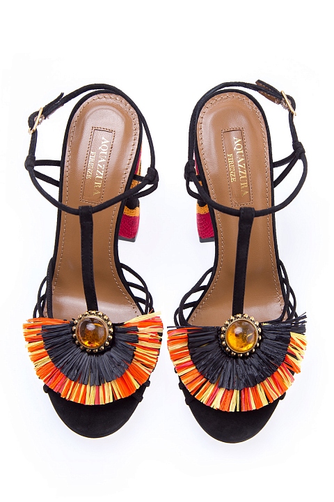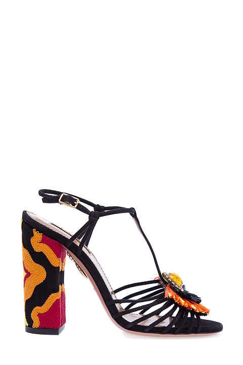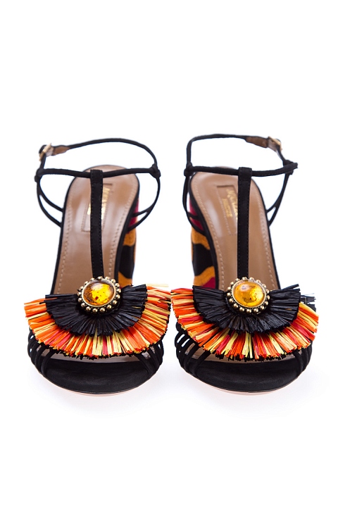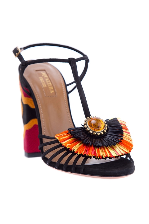 Эффектные босоножки Samba Sandal 105 из коллекции бренда Aquazzura с тонкими ремешками на мыске и на заднике. Модель выполнена из мягкой замши с бархатистой поверхностью черного цвета и дополнена кожаной подошвой и стелькой с названием бренда и фирменной эмблемой в виде ананаса. Мысок декорирован аппликацией из цветной рафии, перекликающейся с узором на каблуке. Лодыжку опоясывает тонкий шнурок с классической пряжкой. Высота каблука 10,5 см. Сделано в Италии.