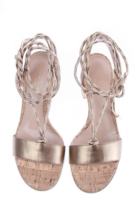 Эффектные босоножки из коллекции Gianvito Rossi, выполненные из кожи с золотистым напылением. Модель закрыта гибкой кожаной подошвой и устойчивым пробковым каблуком с характерными контрастными вкраплениями на поверхности. Застежка осуществляется при помощи тонкого шнурка, обернутого вокруг щиколотки. Высота каблука 6 см. Сделано в Италии.