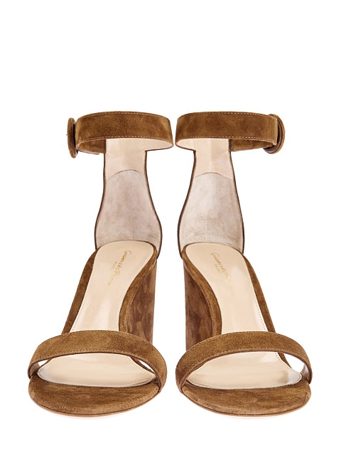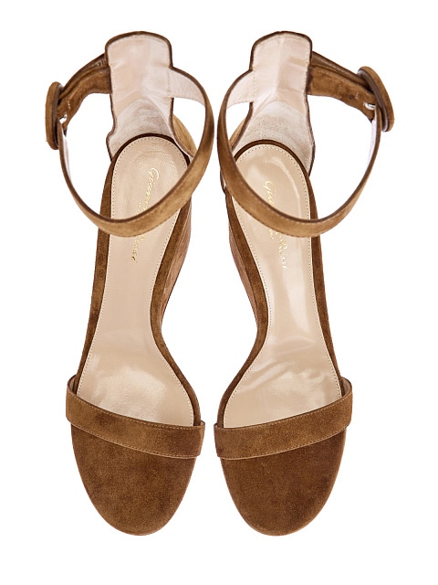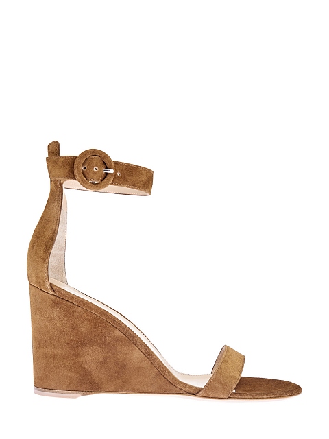 Элегантные босоножки на танкетке от Gianvito Rossi выполнены из мягкой замши базового коричневого оттенка. Минималистичный дизайн с двумя ремешками дополнен обтянутой замшей круглой пряжкой. Амортизирующая стелька из кожи обеспечивает максимальный комфорт в течение дня. Детали: легкая конструкция, подошва из кожи. Сделано в Италии.