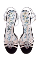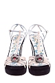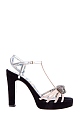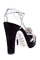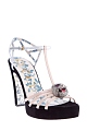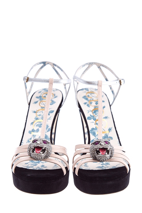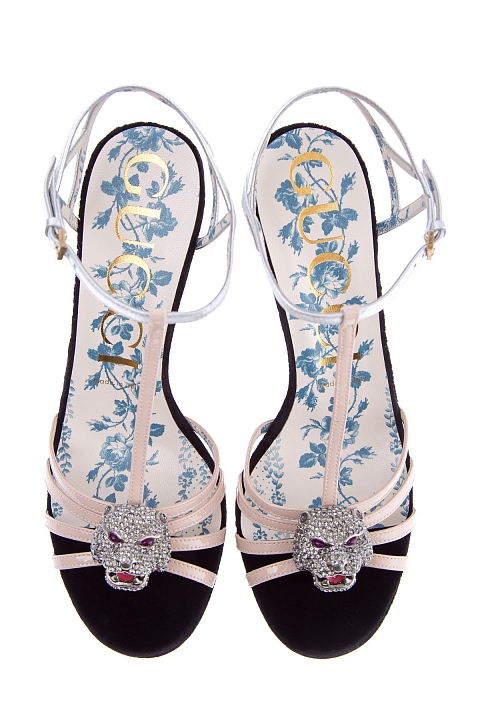 Эффектные босоножки Gucci из кожи, обтянутой велюром чёрного цвета. Модель с открытым мыском, украшенным тонкими кожаными ремешками с брошью в виде головы пантеры. Изделие на массивном устойчивом каблуке с внутренней отделкой с цветочным узором в голубой гамме. Застежка осуществляется при помощи тонких серебристых ремешков и пряжки на щиколотке. Высота платформы под мыском 2 см, высота каблука 10,5 см. Сделано в Италии.