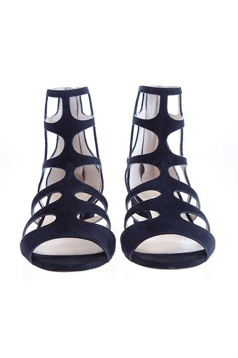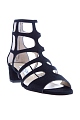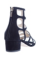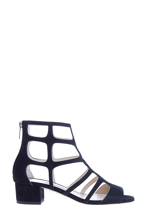 Эффектные сандалии-гладиаторы Ren бренда Jimmy Choo, выполненные из бархатистой замши черного цвета. Модель с открытым мыском закрыта гибкой кожаной подошвой с устойчивым каблуком высотой 4 сантиметра. Застежка-молния вшита в центральный шов на заднике.