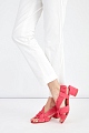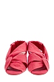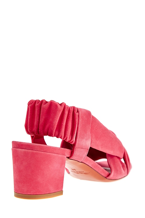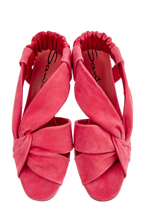 Стильные босоножки от Santoni созданы из мягкой замши насыщенного оттенка фуксии. Особенностью модели стали переплетенные кожаные ленты с перекрученной отделкой на верхней панели. Комфортную фиксацию обеспечивает спинка с широкой эластичной лентой. Детали: устойчивый каблук 5.5 см, внутренняя поверхность из кожи. Сделано в Италии.