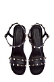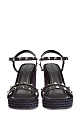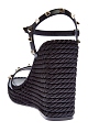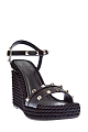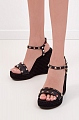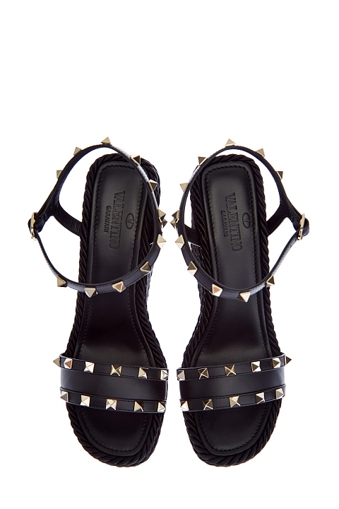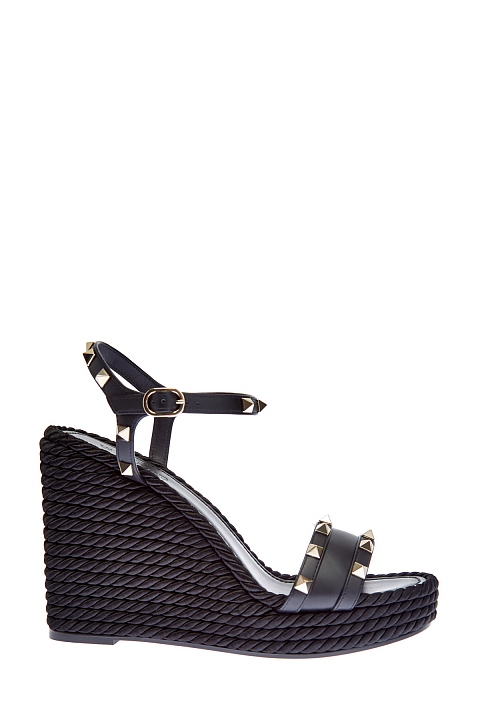 Однотонные босоножки Rockstud от Valentino Garavani созданы из гладкой телячьей кожи с эффектом полировки. Массивная танкетка обтянута бечевкой с атласной фактурой. Заклепки с платиновым напылением подчеркивают присущую бренду роскошь. Детали: регулируемая застежка с пряжкой, стелька из натуральной кожи. Сделано в Италии.