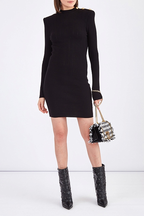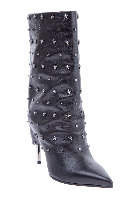 Женские ботильоны из коллекции осень-зима бренда Balmain, созданные из гибкой телячьей кожи черного цвета с легким матовым блеском на поверхности. Модель с зауженным мыском на изящном каблуке-шпильке в серебристом металлическом оттенке. Особенностью изделия стал широкий отворот на голенище, украшенный вручную заклепками в виде бусин-кабошонов и звезд с винтажным патинированным покрытием. Высота каблука 10,5 см, высота голенища 20 см.