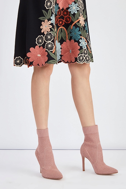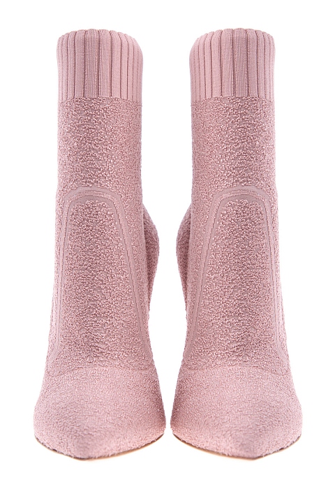 Стильные ботильоны Fiona из осенне-зимней коллекции бренда Gianvito Rossi на тонком изящном каблуке-шпильке, созданные из плотной эластичной ткани нежно-розового цвета с фактурной буклированной поверхностью. Модель характеризуется выверенной колодкой из мягкой телячьей кожи. Высота каблука 10,5 см. Сделано в Италии.