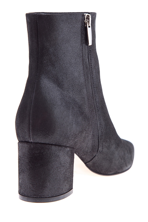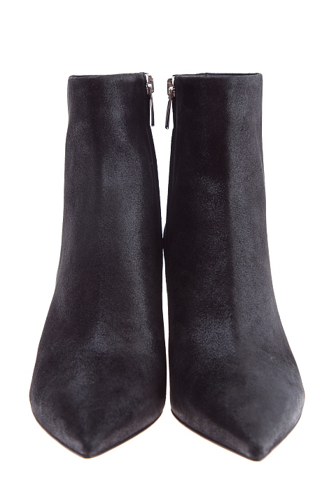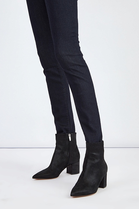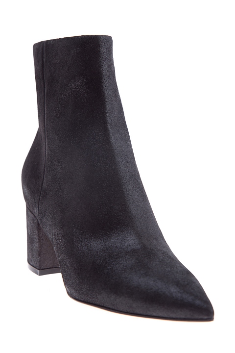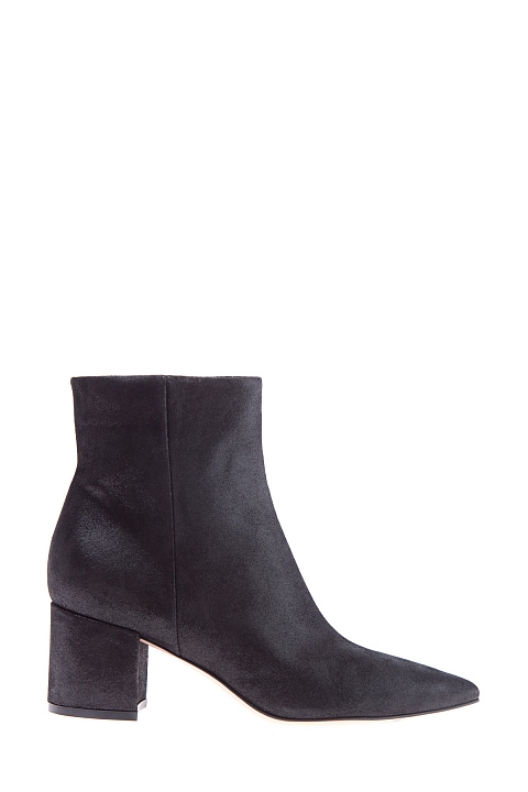 Классические ботильоны Gianvito Rossi со свободным голенищем и заостренным мыском. Модель выполнена из бархатистой замши с особой обработкой, образующей легкий элегантный блеск на всей поверхности. Внутренняя кожаная отделка контрастного оттенка перекликается с прочной подошвой. Металлические пуллеры дополнены тисненым названием бренда. Изделие на устойчивом квадратном каблуке высотой 6 сантиметров. Сделано в Италии.