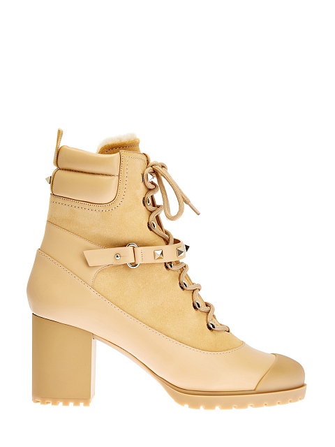 Теплые ботильоны от Valentino Garavani. Модель представлена в универсальном оттенке camel и сочетает четыре фактуры: матовый каучук, натуральную кожу, бархатистую замшу и густой овечий мех. Нотку фирменного стиля глэм-рок в образ вносит треккерская шнуровка с металлическими крючками, а также мягкие манжеты на спинке. Рифленый протектор обеспечивает надежное сцепление с любыми поверхностями. Детали: подкладка из меха, устойчивый каблук, заклепки с платиновым напылением. Сделано в Италии.