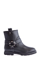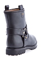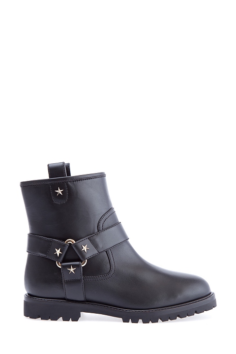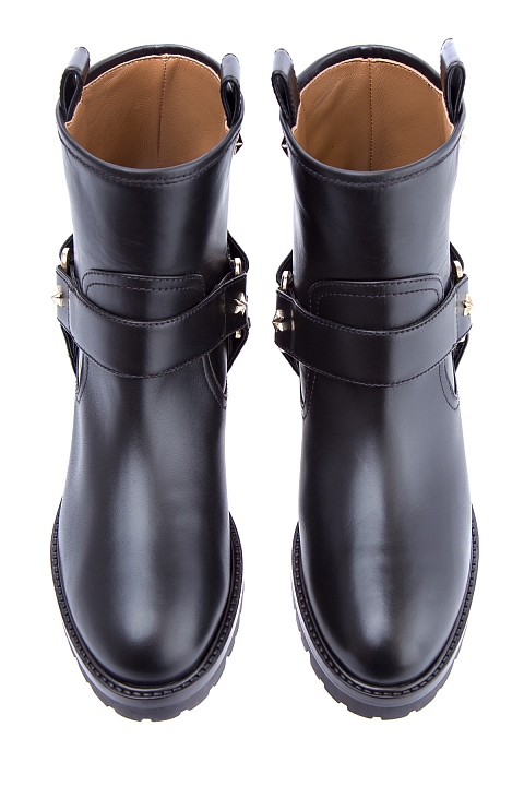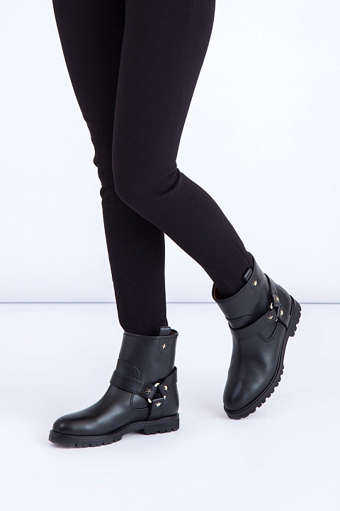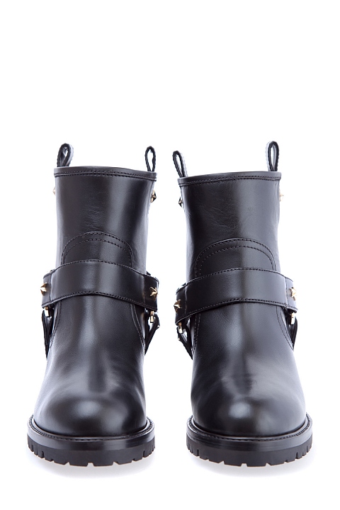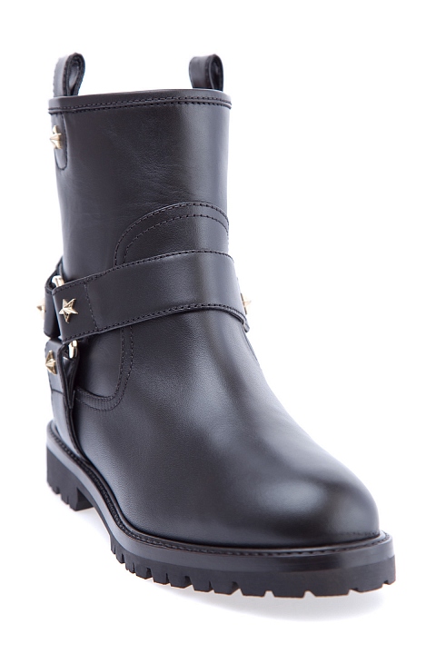 Женские ботинки Aquazzura в байкерсом стиле, созданные из гладкой телячьей кожи с легким матовым блеском. Модель характеризуется петлями для подтягивания и широкими декоративными ремешками с заклепками-звездами. Изделие закрыто плотной подошвой с тракторным протектором и небольшим квадратным каблуком высотой 2,5 см. Высота голенища 15 см. Сделано в Италии.