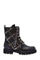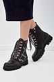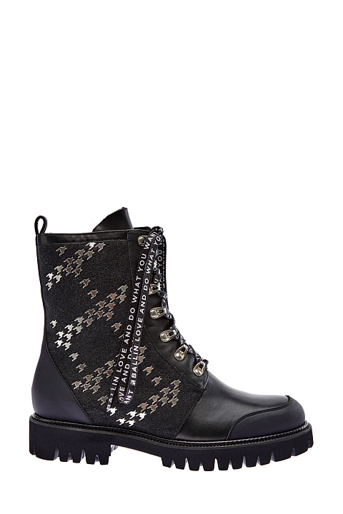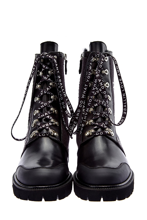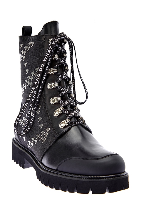 Эффектные байкерские ботинки от Ballin выполнены из гладкой кожи. Вставки из шерстяного драпа вносят в образ контраст фактур, а заклепки сочетаются с массивными люверсами. Детали: принтованная шнуровка, массивная подошва с рифленым протектором, подкладка из меха, застежки-молнии, высота голенища 17.5 см. Длина по стельке в размере 38.5 — 24.5 см.