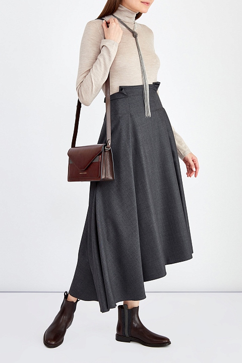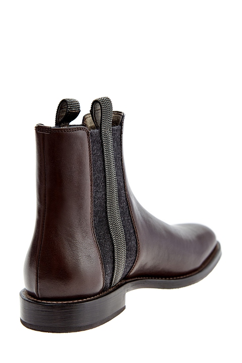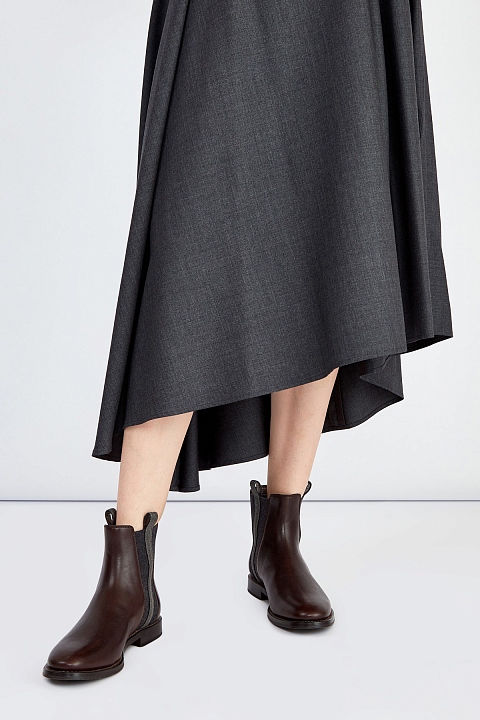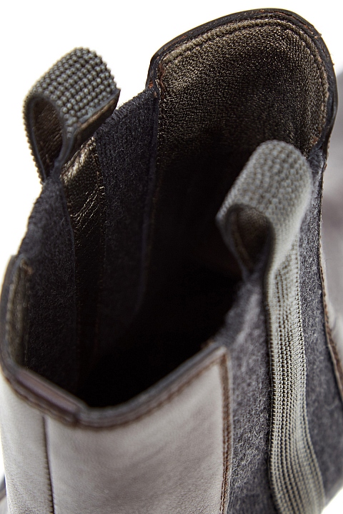 Высокие ботинки Brunello Cucinelli выполнены из кожи Riding, которая по своей текстуре напоминает кожу для аксессуаров верховой езды. Эластичные вставки по бокам из кашемира, расшитые тонкими нитями цепочки Мониль, исключают необходимость молнии и дополнительных застежек. Детали: высота голенища 12.5 см, высота каблука 2.5 см., подкладка из кожи ламы, кожаная подошва, прорезиненный протектор. Сделано в Италии.
