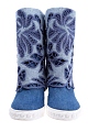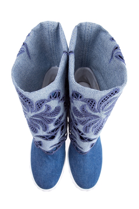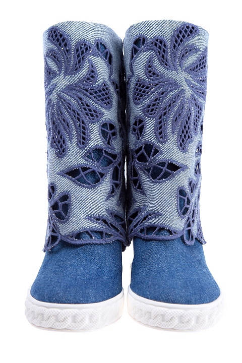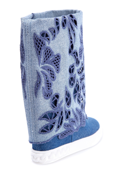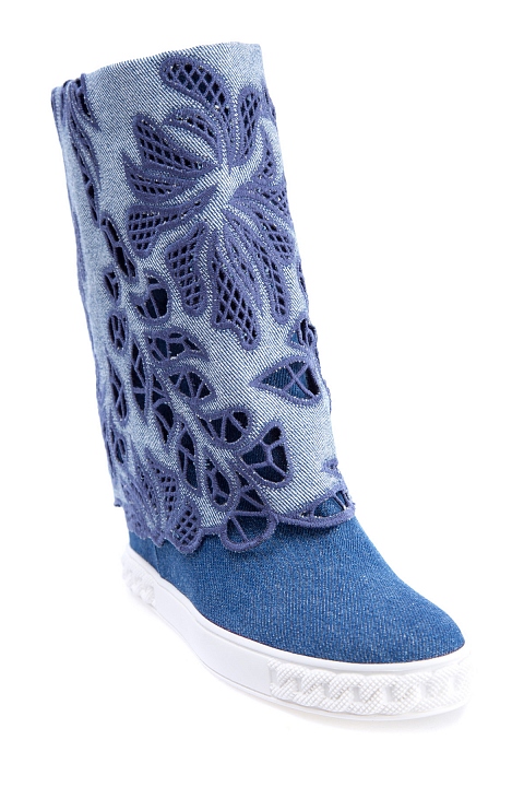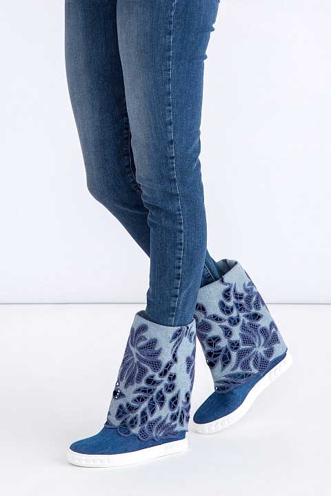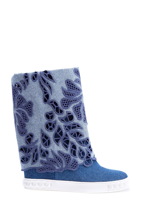 Стильные женские полусапоги Casadei, выполненные из кожи и отделанные плотным денимом синего цвета. Модель с круглым мыском и плотной резиновой подошвой с украшением в виде цепи и рифленым протектором. Изделие характеризуется отворотом на голенище с ажурными цветочными аппликациями. Высота потайной танкетки 9,5 см. Сделано в Италии.