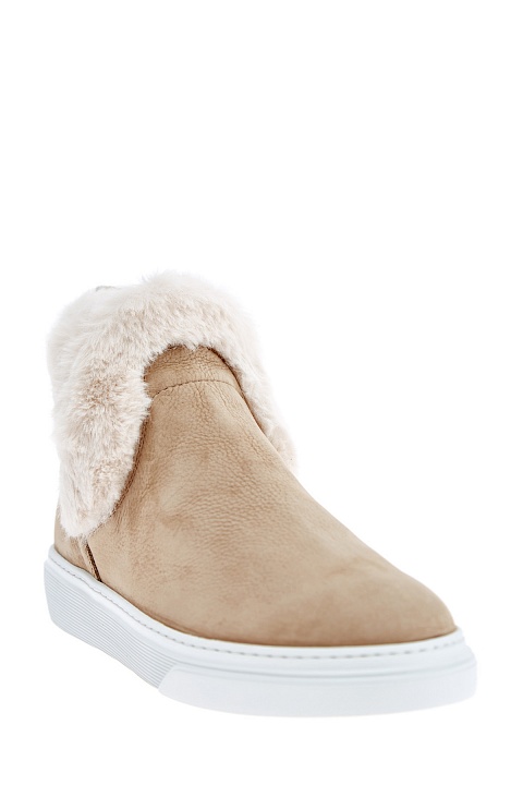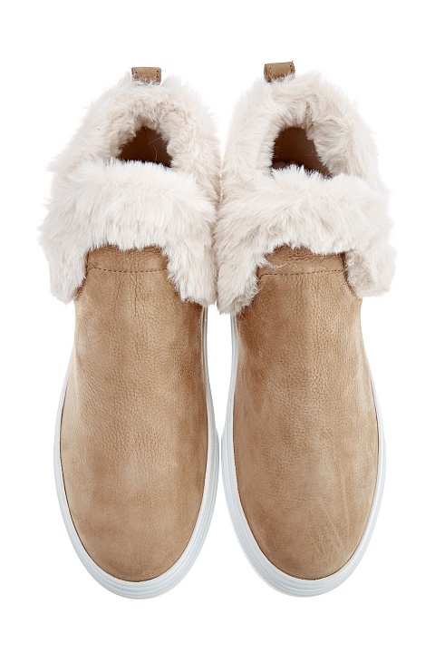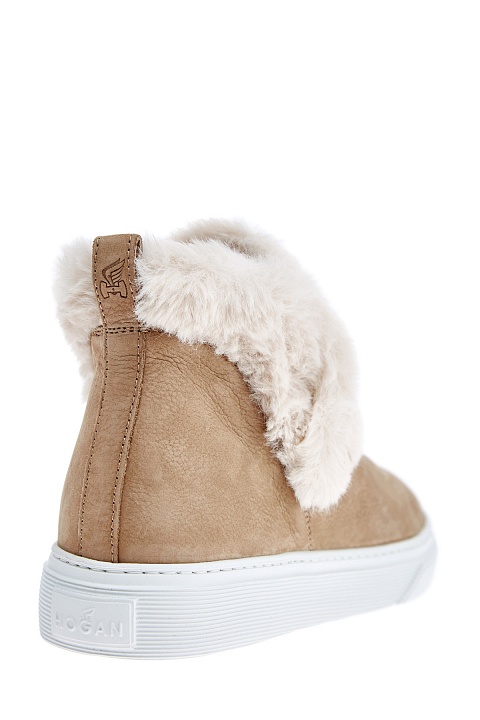 Высокие ботинки от Hogan выполнены из натуральной кожи с матовой поверхностью песочного оттенка и подчеркнутым натуральным узором. Надежную защиту от низких температур обеспечивает отделка манжеты из пушистого эко-меха. Миндалевидная форма мыска и литая подошва заимствованы у классических слипонов и создают образ в стиле спортшик. Детали: рифленый рант, кожаная стелька.