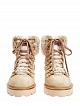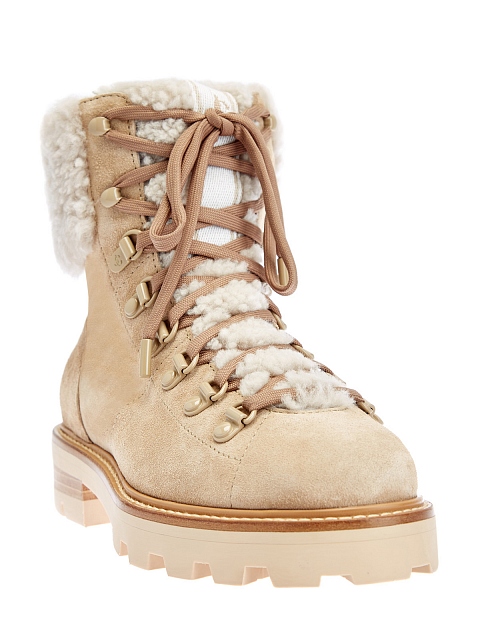 Высокие женские ботинки Eshe от Jimmy Choo выполнены из фактурной замши в песочной гамме. Модель на подкладке из мягкой овчины будет актуальна как для городских аутфитов, так и для горнолыжных курортов. Аутентичная шнуровка на люверсах заимствована у туристической обуви, массивная подошва с рифленым протектором предотвращает скольжение. Детали: брендированная фурнитура, эластичная вставка из текстиля на передней планке. Сделано в Италии.