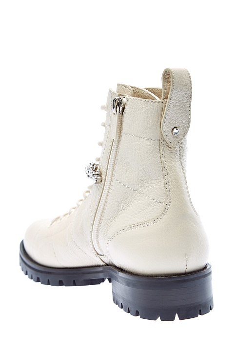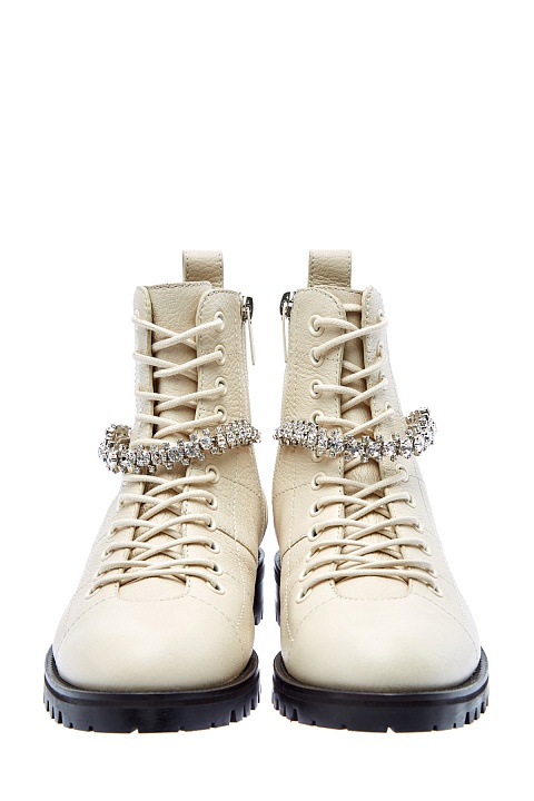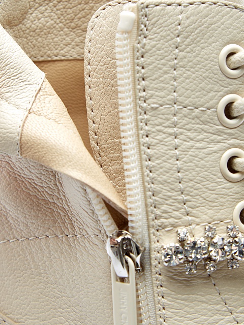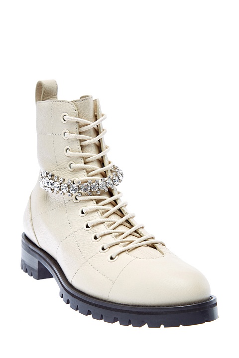 Высокие ботинки Cruz от Jimmy Choo созданы из плотной зернистой кожи в натуральном белом оттенке. Модель в байкерском стиле на массивной подошве с рифленым протектором и высоким голенищем 13 см. Изящный штрих изделию придают ленты с инкрустацией прозрачными кристаллами. Детали: люверсы в тон, застежка-молния, внутренняя отделка из кожи. Длина по стельке в размере 38.5 — 24.5 см. Сделано в Италии.