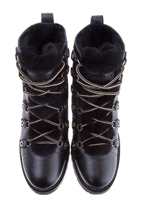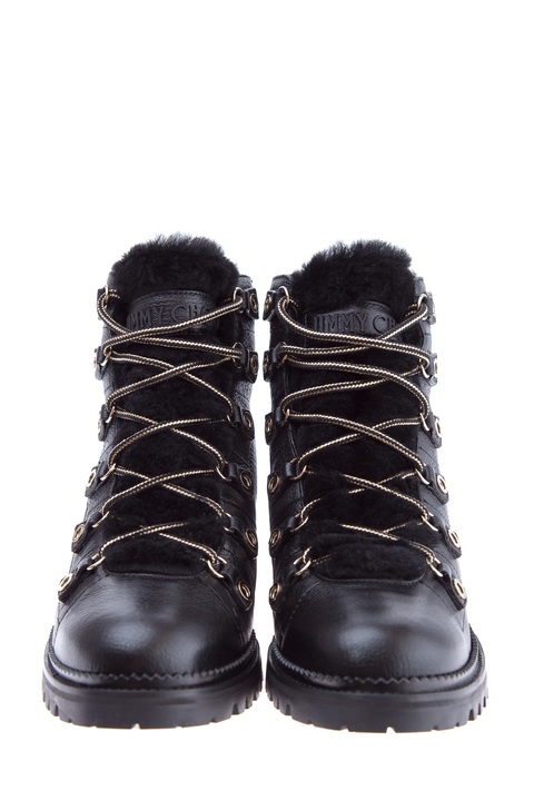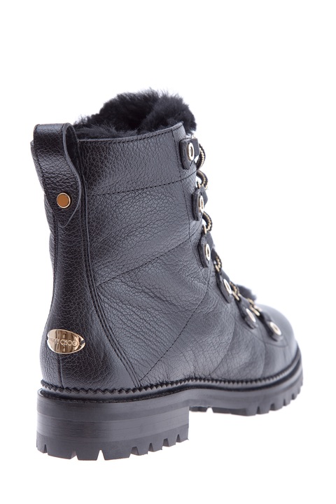 Высокие женские ботинки Hillary из коллекции осень-зима от Jimmy Choo созданы из фактурной зернистой кожи в классическом черном цвете. Модель с миндалевидным мыском декорирована стеганым узором в широкую горизонтальную полоску, а также язычком с меховой отделкой и аппликацией с логотипом бренда. Шнуровка на аутентичных «армейских» петлях позволяет создать образ в стиле милитари. Внутренняя подкладка из меха обеспечивает защиту от низких температур. Подошва с рифленым узором протектора предотвращает скольжение. Специальная петля позволяет быстро надевать обувь. Сделано в Италии.