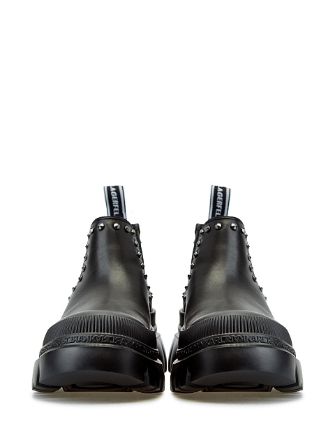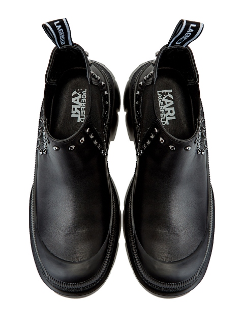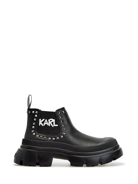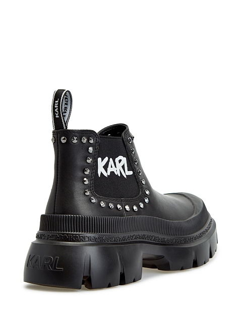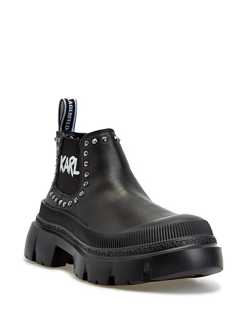 Эффектные женские женские ботинки от Karl Lagerfeld выполнены из гладкой телячьей кожи в черном цвете. Эластичные вставки в стиле челси обеспечивают комфортную посадку, нанесенный вручную контрастный логотип и литые заклепки Gore подчеркивают неформальный стиль изделия. Детали: массивная подошва на противоскользящем протекторе, рифленый рант, язычок на спинке.