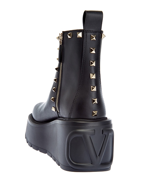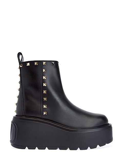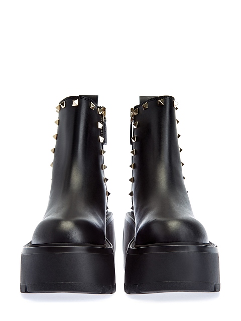 Эффектные ботинки Uniqueform на высокой платформе от Valentino Garavani. Модель из гладкой телячьей кожи дополнена фирменными заклепками с платиновым напылением, противоскользящая подошва с декором VLogo Signature на ранте обеспечивает максимальный комфорт в движении. Сделано в Италии.