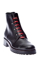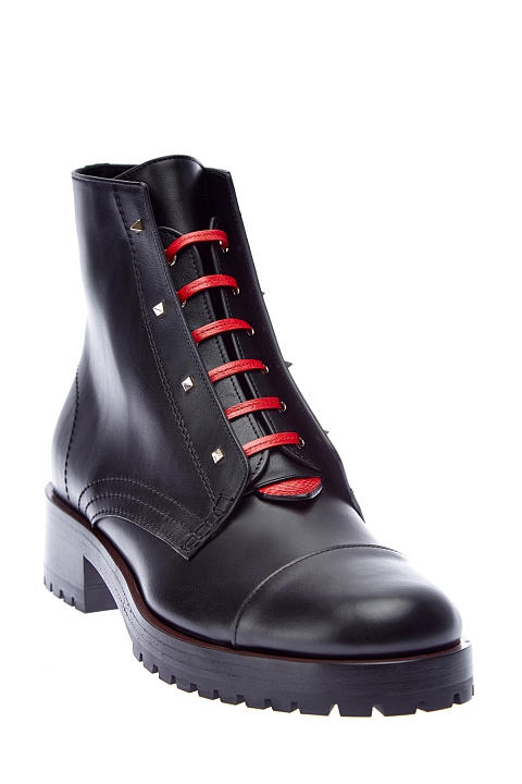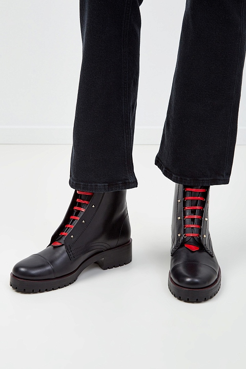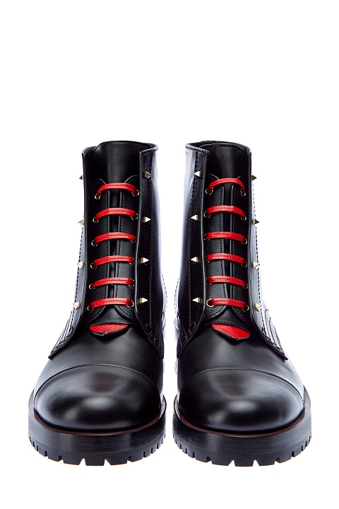 Ботинки из полированной телячьей кожи от Valentino Garavani созданы в черном цвете. Особенностью модели стала контрастная шнуровка из кожаных лент, выполненная в культовом оттенке Rosso. Заклепки с платиновым покрытием вносят в образ элемент фирменной роскоши. Детали: массивная подошва с рельефным протектором и каблуком 4 см, внутренняя отделка из натуральной кожи. Длина стельки для размера 39.5 составляет 26 см. Сделано в Италии.