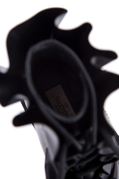 Высокие женские ботинки из коллекции осень-зима от Valentino Garavani выполнены из прочной кожи гладкой выделки черного тона с легким матовым блеском по поверхности. Фирменный шик обуви придают декор аппликацией в виде сердца, расшитого стеклярусом и кристаллами вручную, а также элегантные оборки по линии шнуровки и верхней кромке. Модель надежно сохраняет тепло благодаря массивной подошве, а внутренняя отделка из натуральной кожи и дышащая стелька обеспечивают комфорт в течение дня. Сделано в Италии.