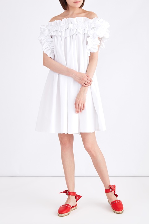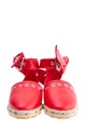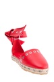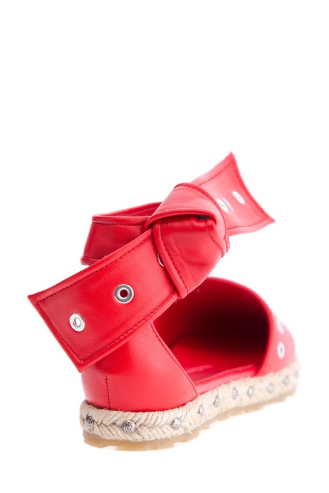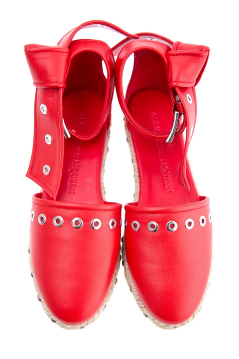 Яркие женские босоножки из весенне-летней коллекции Alexander McQueen выполнены из мягкой кожи наппа насыщенного огненно-красного оттенка. Модель с открытыми боковыми поверхностями стилизована под эспадрильи благодаря плетеному ранту соломенного тона и закругленному мыску. Изделия декорированы металлическими заклепками и люверсами, которые создают образ в фирменном стиле. Застежка с регулируемым ремнем дополнена объемным бантом. Сделано в Италии.