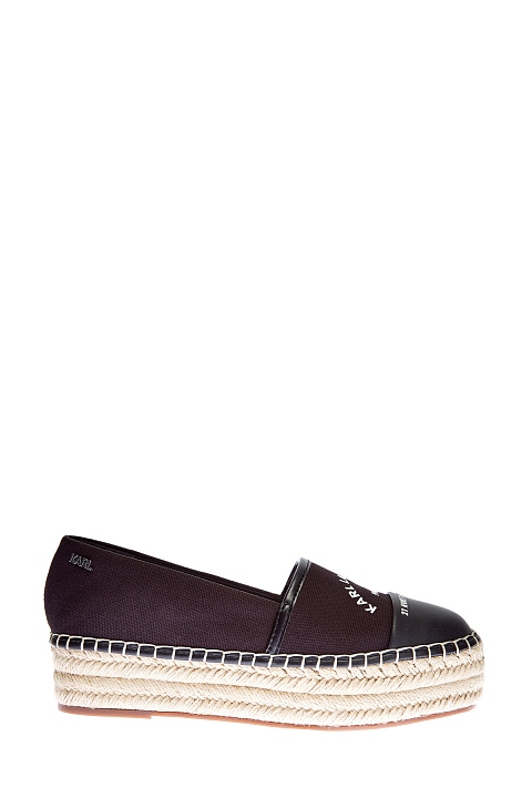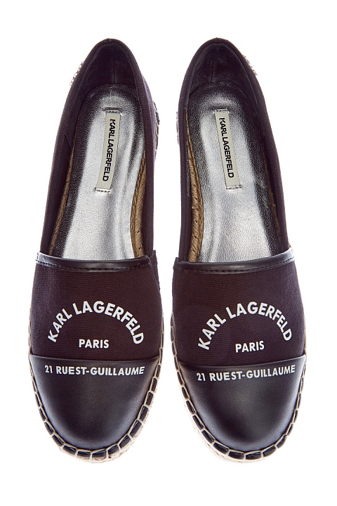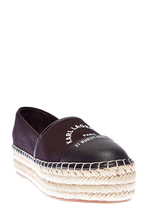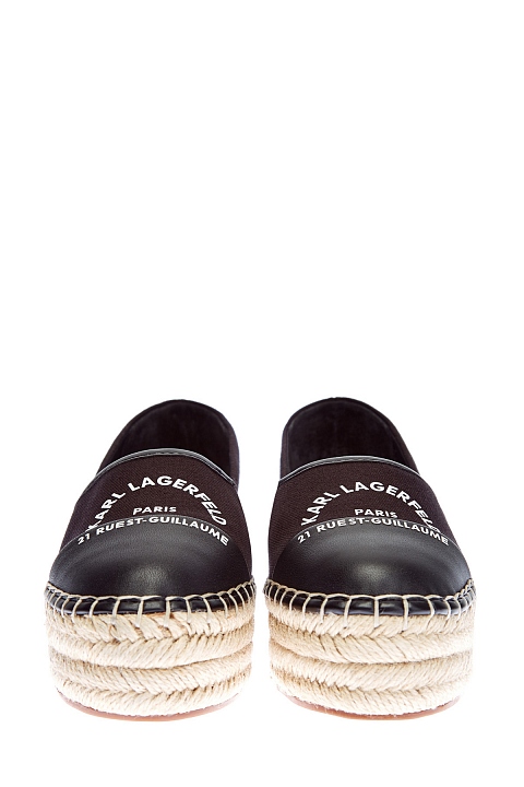 Эспадрильи на массивной джутовой подошве от от Karl Lagerfeld созданы в знаковом для бренда черном цвете. Мысок и кромки с кожаной отделкой в сочетании с плотной хлопковой тканью создают игру на контрастах. Фирменный штрих — аппликация Rue St-Guillaume. Детали: стелька из натуральной кожи, литая монограмма.
