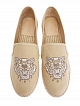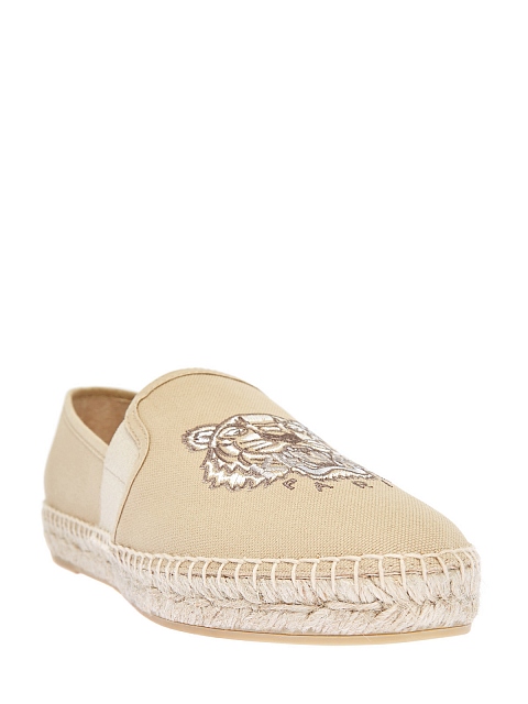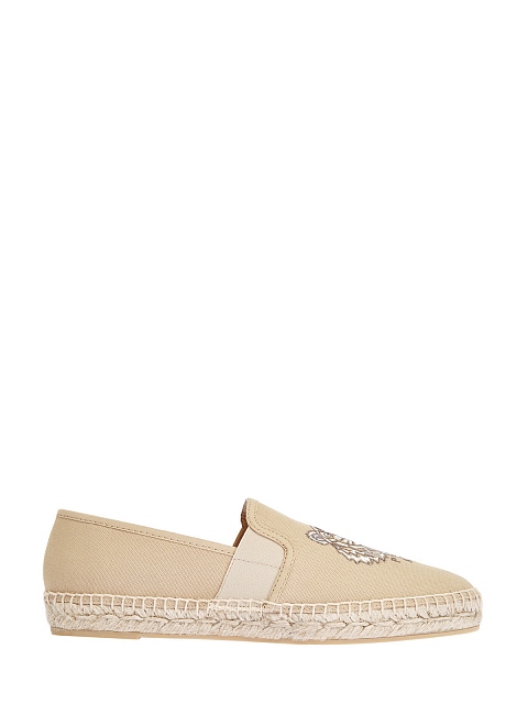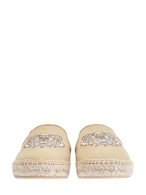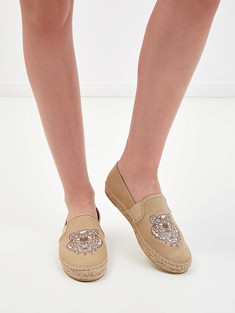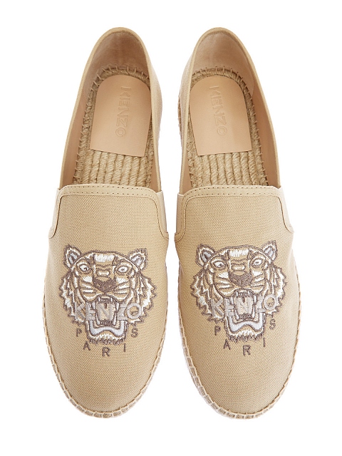 Легкие эспадрильи от Kenzo выполнены из дышащего хлопкового полотна. Верхняя панель обуви декорирована контрастной вышивкой с логотипом «KENZO Paris» и фирменным изображением тигра. Эластичные вставки по бокам позволяют легко снимать и надевать модель, а также обеспечивают комфорт в движении. Традиционный плетеный рант и стелька из джута завершают модель.