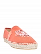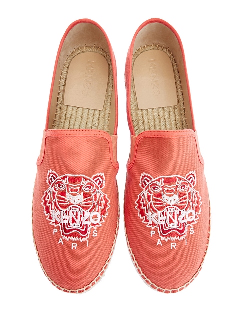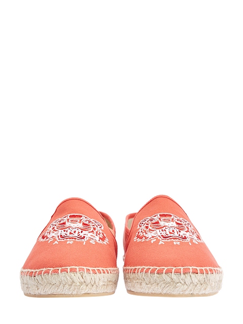 Легкие женские эспадрильи от Kenzo выполнены из дышащего хлопкового полотна в коралловом оттенке. Верхняя панель обуви декорирована контрастной вышивкой с логотипом «KENZO Paris» и фирменным изображением тигра. Эластичные вставки по бокам позволяют легко снимать и надевать модель, а также обеспечивают комфорт в движении. Традиционный плетеный рант и стелька из джута завершают модель.
