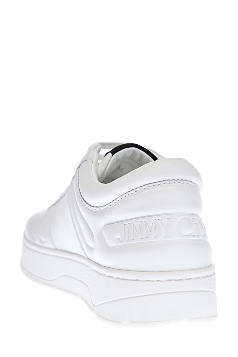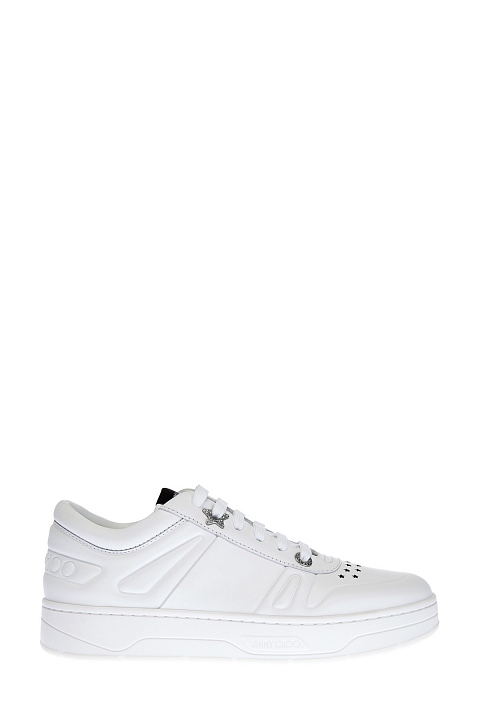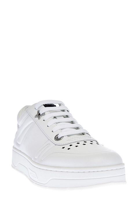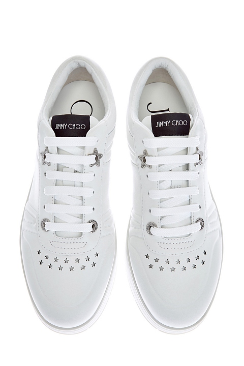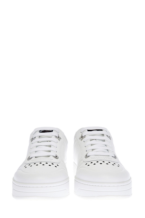 Кеды Hawaii из белой телячьей кожи от Jimmy Choo. Минималистичный дизайн дополнен сверкающими акцентами — литыми звездами и объемными люверсами с инкрустацией кристаллами. Перфорированный узор на мыске придает образу нотку стиля спортшик. Детали: массивная амортизирующая подошва, фигурное тиснение, мягкие манжеты для комфортной посадки. Сделано в Италии.