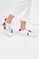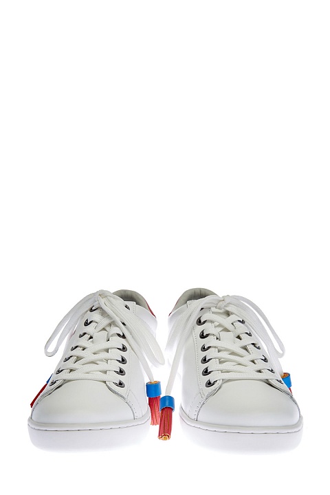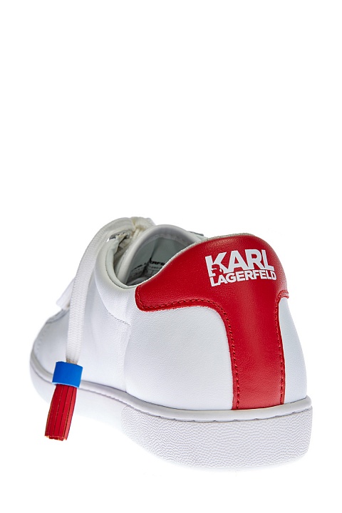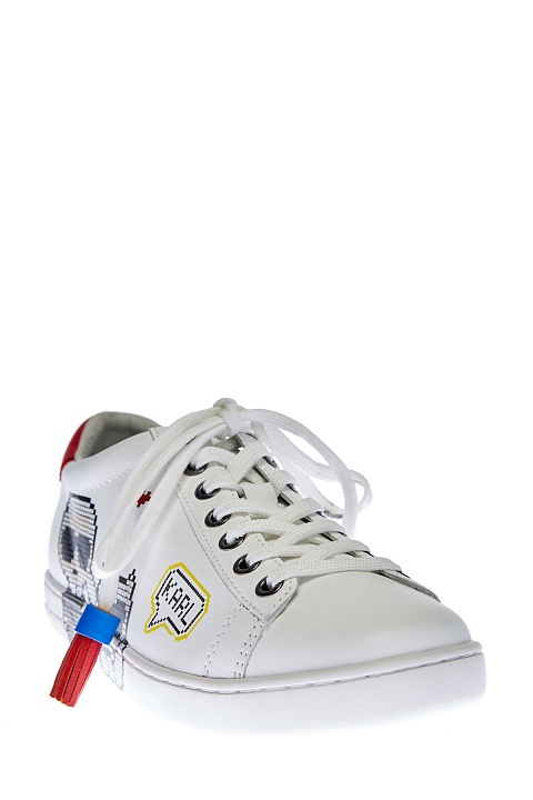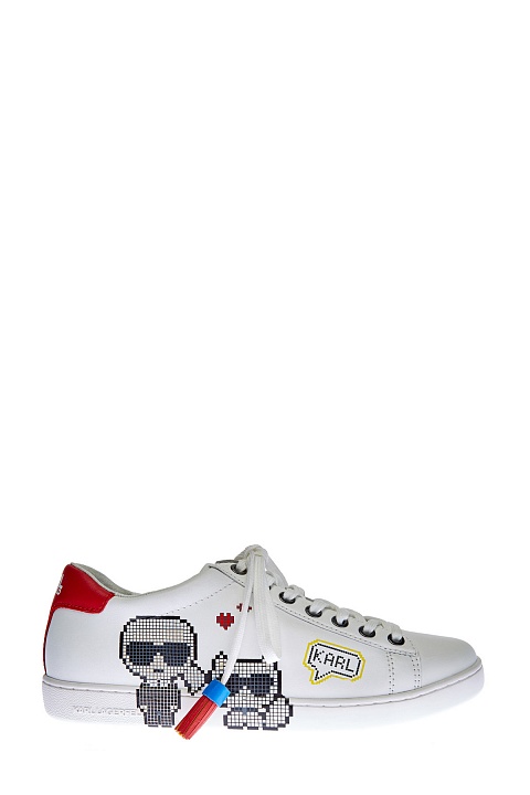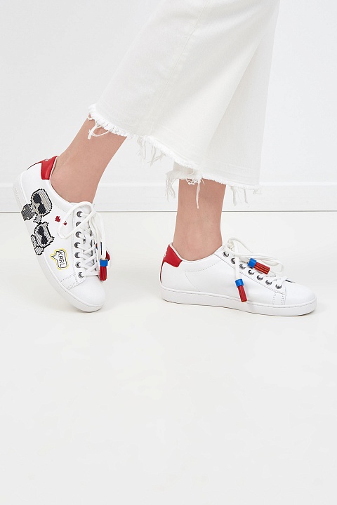 Базовые белые кеды от Karl Lagerfeld созданы из матовой кожи. Модель из коллекции K/Pixel украшена аппликацией с пиксельным принтом в виде дизайнера и его кошки Шупетт. Яркие акценты в образ вносит объемная бахрома из кожи на шнурках и алые вставки на спинке изделий. Детали: закругленный мысок, стелька из натуральной кожи.