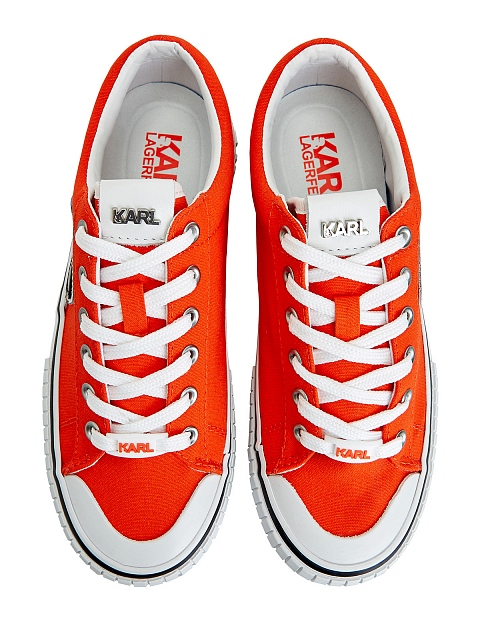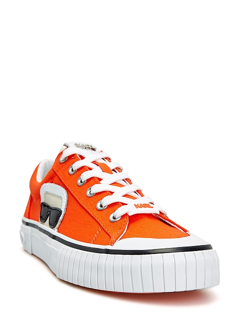 Эффектные кеды K/Ikonik от Karl Lagerfeld выполнены из плотного хлопка в оранжевом цвете. Фирменный штрих — аппликация с изображением дизайнера на боковых панелях и металлизированный логотип. Литая подошва из амортизирующего каучука обеспечивает комфорт в движении.