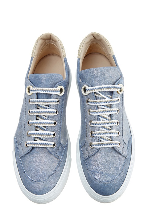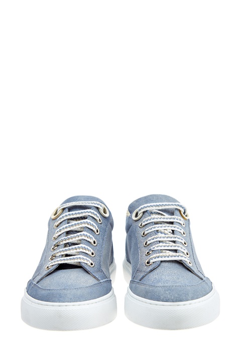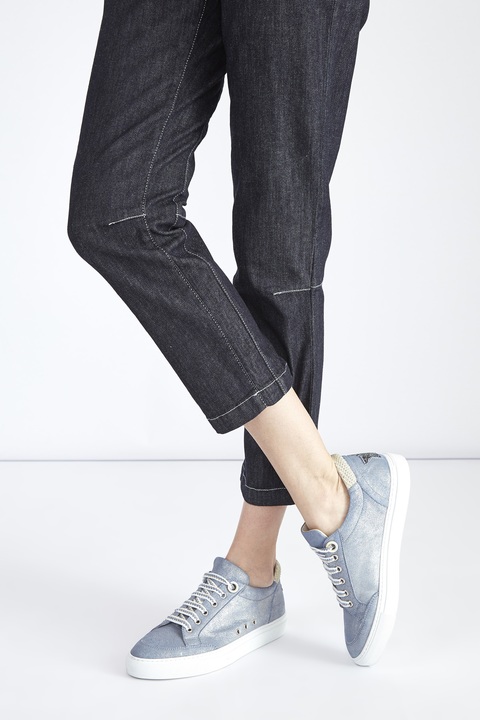 Стильные кеды от Lorena Antoniazzi выполнены из шлифованной кожи с сияющим напылением в пастельном голубом оттенке. Модель оснащена шнуровкой на металлические люверсы и дополнена отверстиями для циркуляции воздуха. Детали: миндалевидный мысок, массивная подошва, выложенная кристаллами аппликация в виде символа бренда. Сделано в Италии.