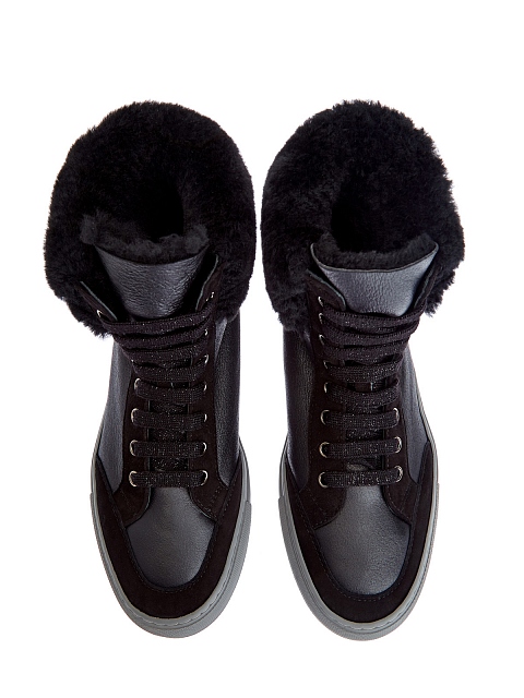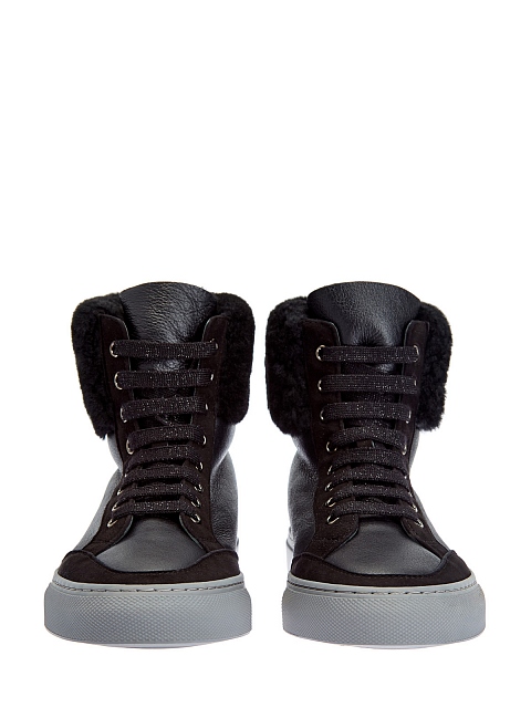 Высокие кеды от Lorena Antoniazzi выполнены из матовой крупнозернистой кожи. Массивная литая подошва и отделка из густого овечьего меха делает модель идеальным дополнением зимних образов. Фирменный штрих — символика бренда из кристаллов Swarovski. Детали: шнуровка из шерстяной пряжи с нитью люрекса, замшевая отделка. Сделано в Италии.