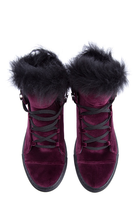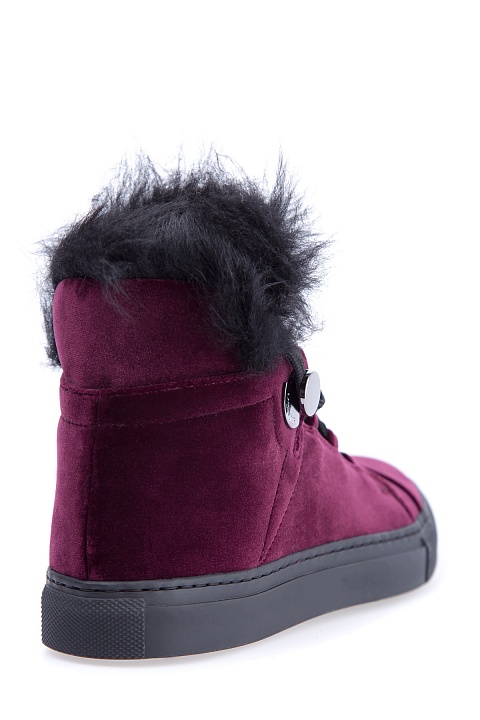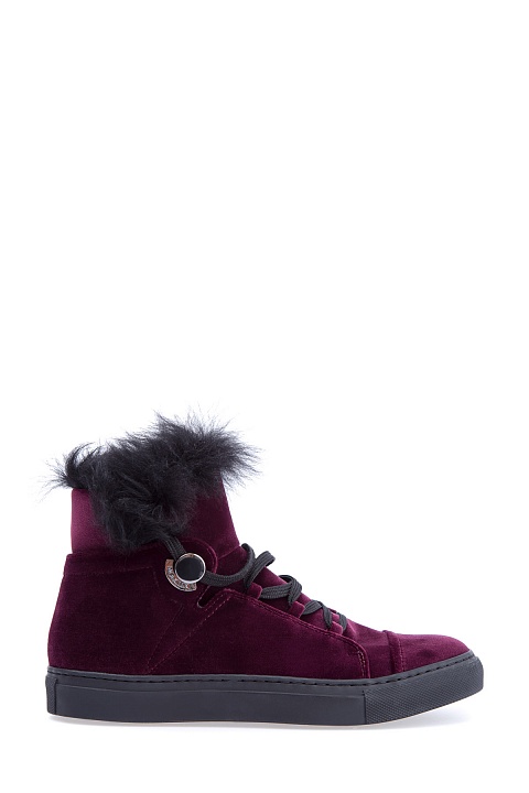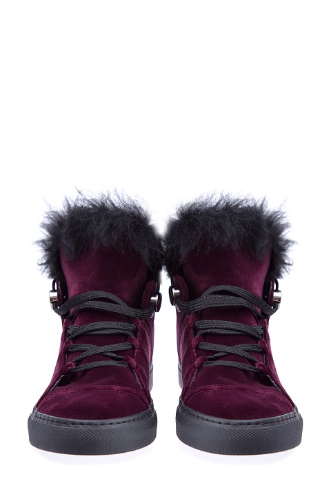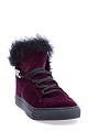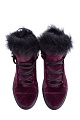 Эффектные женские кеды Anne бренда Moncler с частичным утеплением мехом. Модель создана из телячьей кожи, обтянутой мягким велюром темно-фиолетового тона. Шнуровка дополнена крючками в форме фирменного логотипа бренда. Цельная резиновая подошва черного цвета предотвращает попадание влаги внутрь и обеспечивает комфортное сцепление с любой поверхностью.