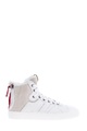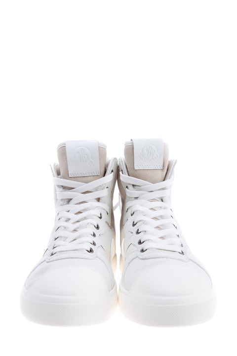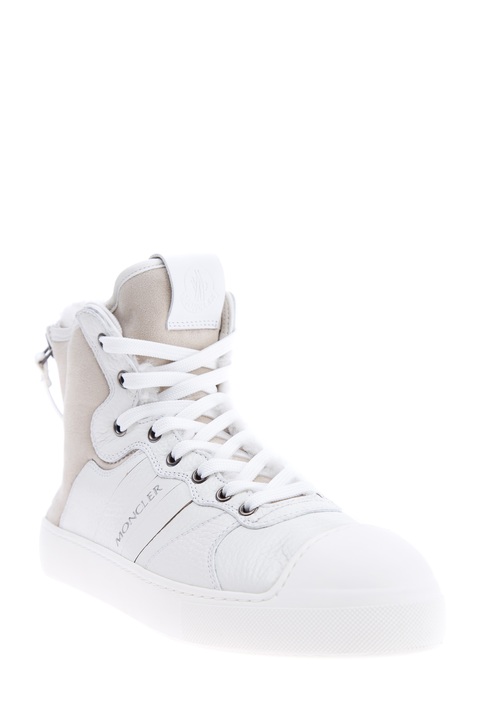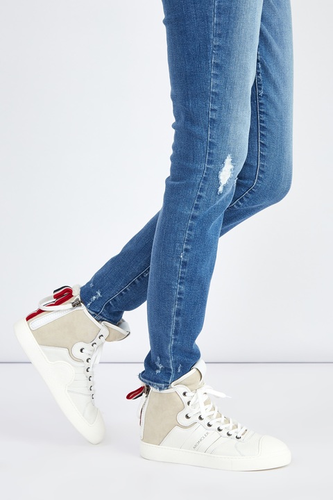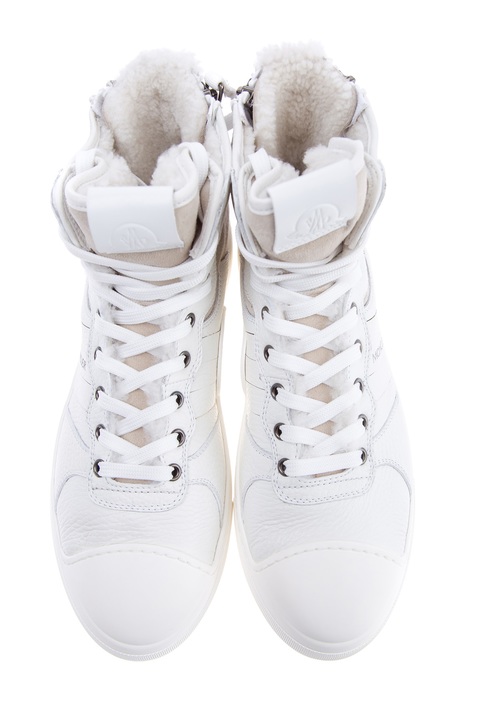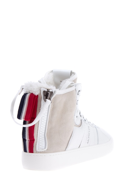 Высокие женские кеды Kalindi от Moncler, выполненные из овчины в бежевой гамме и деталями из овечьей кожи с тиснением в стиле кожи оленя белого тона. Модель характеризуется внутренним утеплением, функциональной шнуровкой и застежками-молниями на заднике. Фирменный стиль бренда отражен в нашивке с язычком для подтягивания в гамме Модного Дома.