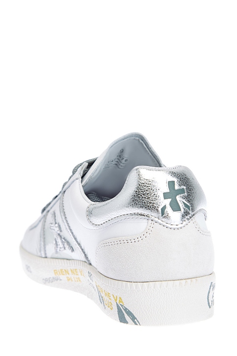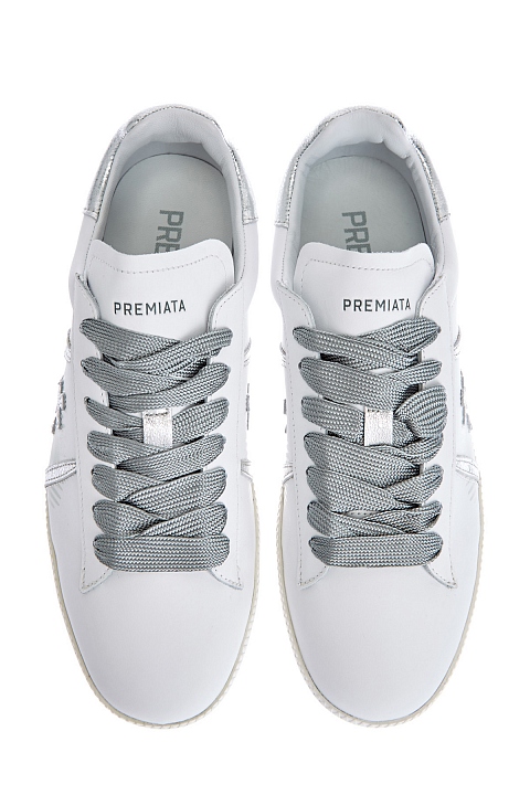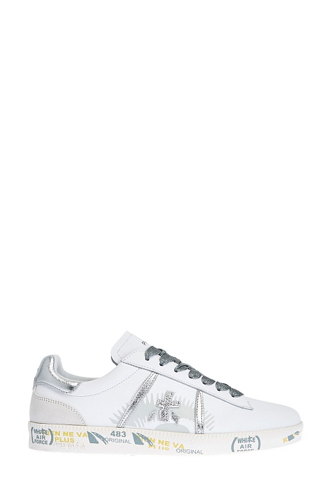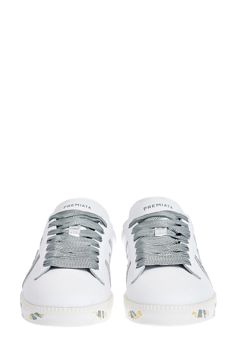 Кеды «Andyd» от Premiata созданы из мягкой телячьей кожи в белом цвете. Культовая модель оснащена массивной и при этом легкой амортизирующей подошвой, что делает обувь идеальной для городских условий. Фирменный стиль подчеркивают монохромными нашивки из металлизированной кожи и текстовый принт на ранте. Детали: внутренняя отделка из кожи, контрастная шнуровка.