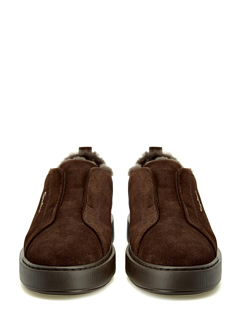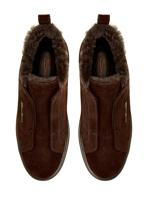 Женские кеды от Santoni созданы вручную из мягкой бархатистой замши в коричневом оттенке. Модель оснащена легкой амортизирующей литой подошвой, отделка из овчины обеспечивает максимальный комфорт в холодное время года. Фирменный стиль подчеркивает металлизированный логотип и тиснение на ранте. Сделано в Италии.