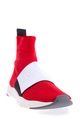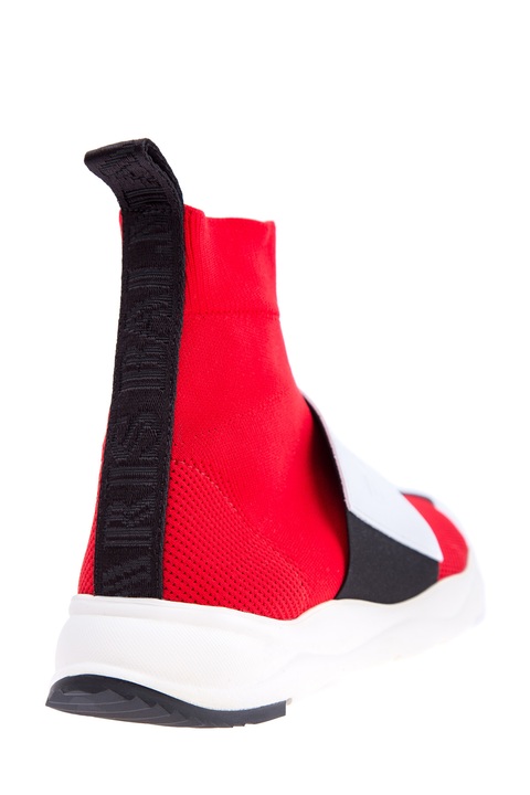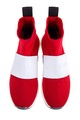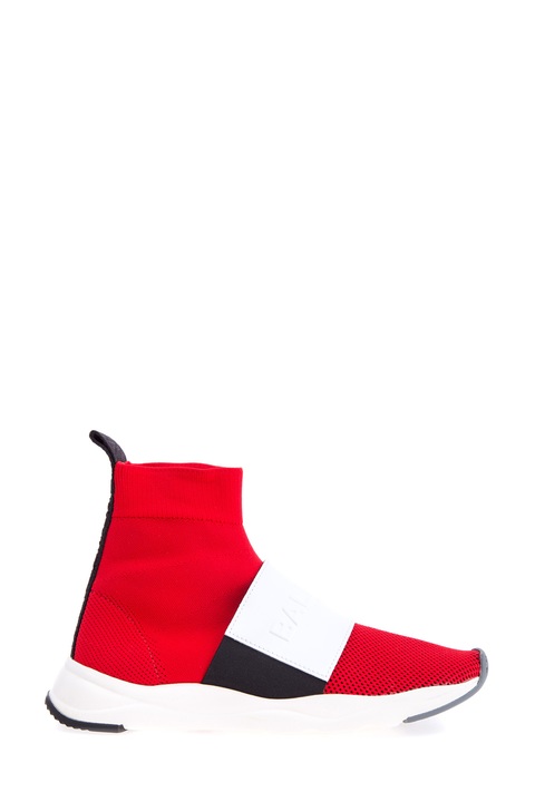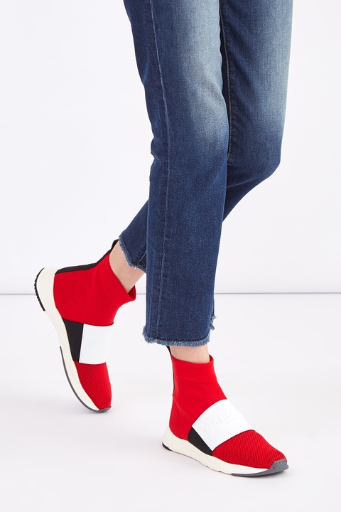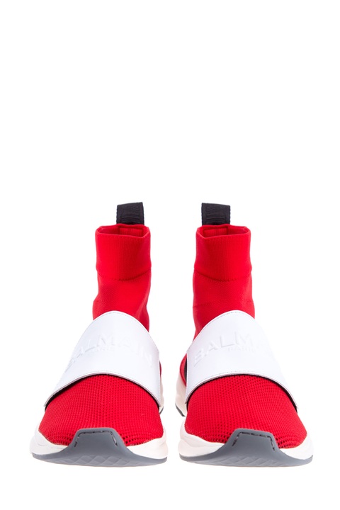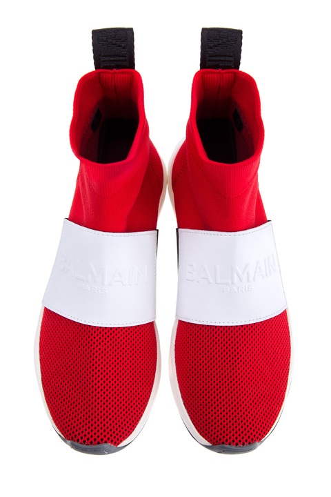 Эффектные кроссовки-хайтопы из весенне-летней коллекции Balmain обеспечивают комфортную поддержку стопы за счет тянущейся вискозы в густом алом оттенке. Кожаный ремешок белоснежного тона с тисненой монограммой бренда, опоясывающий свод стопы, вторит движениям благодаря эластичным вставкам и перекликается с цветом подошвы. Легкая подошва обеспечивает амортизацию при ходьбе. Резинка в рубчик вокруг щиколотки завершает яркий футуристичный образ.